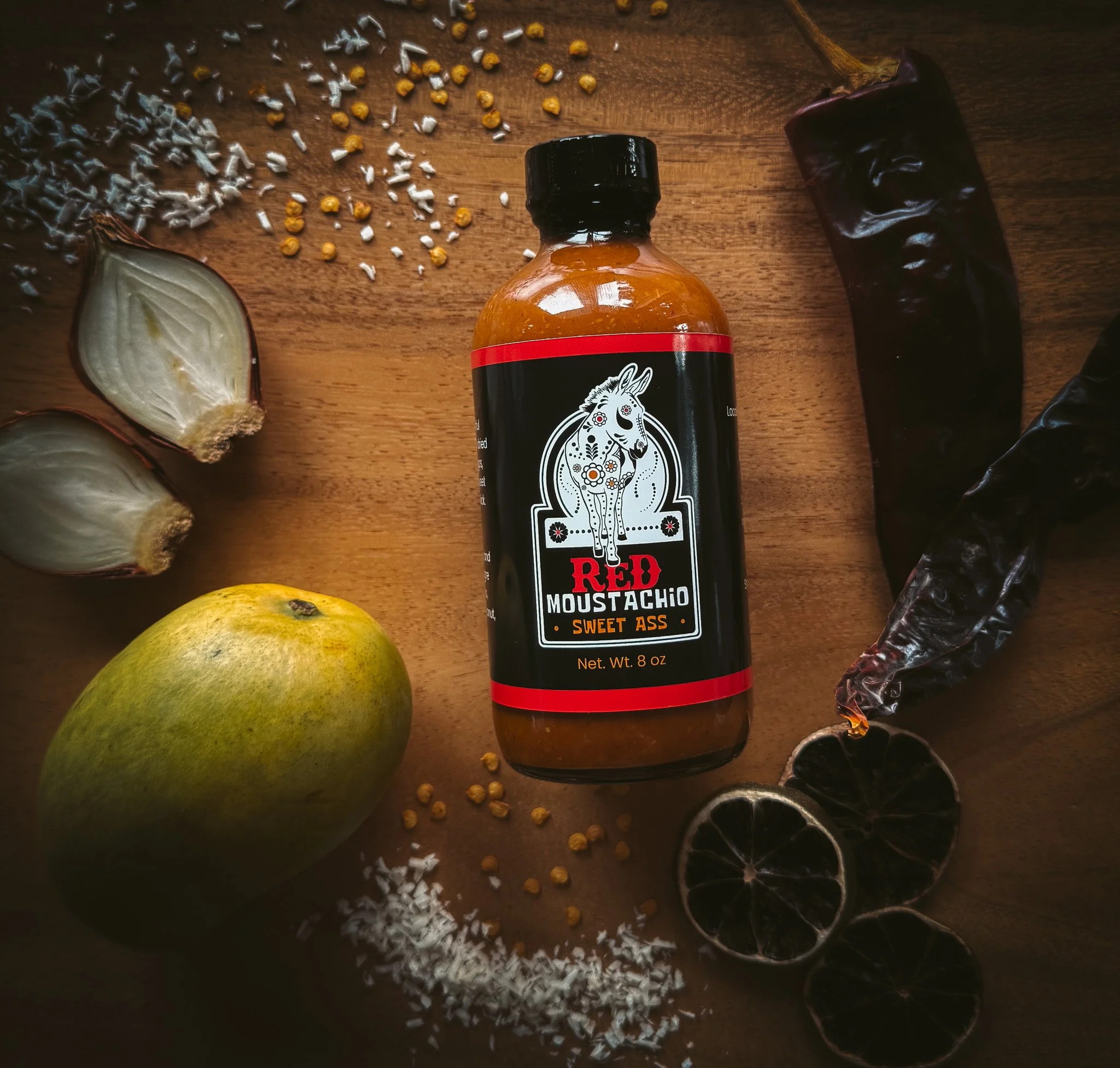 Mangos, guajillo, onza, and arbol chiles, champagne vinegar, sweet onions, garlic, agave syrup, coconut, lime juice, spices.